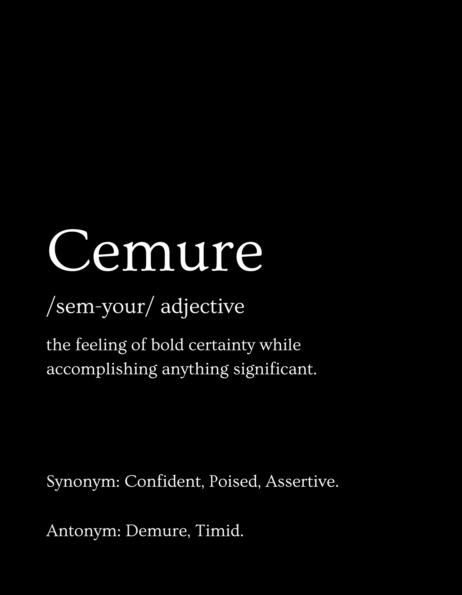 Cemure is a synonym for confidence. We removed the "D" in Demure and replaced it with a "C" for confidence.... CEMURE!